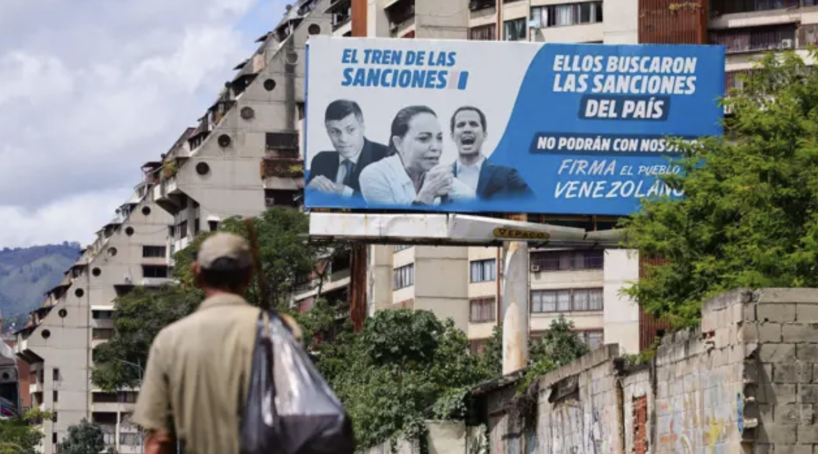 A billboard in Caracas accuses Machado and other opposition politicians of seeking sanctions against Venezuela. Photo Getty